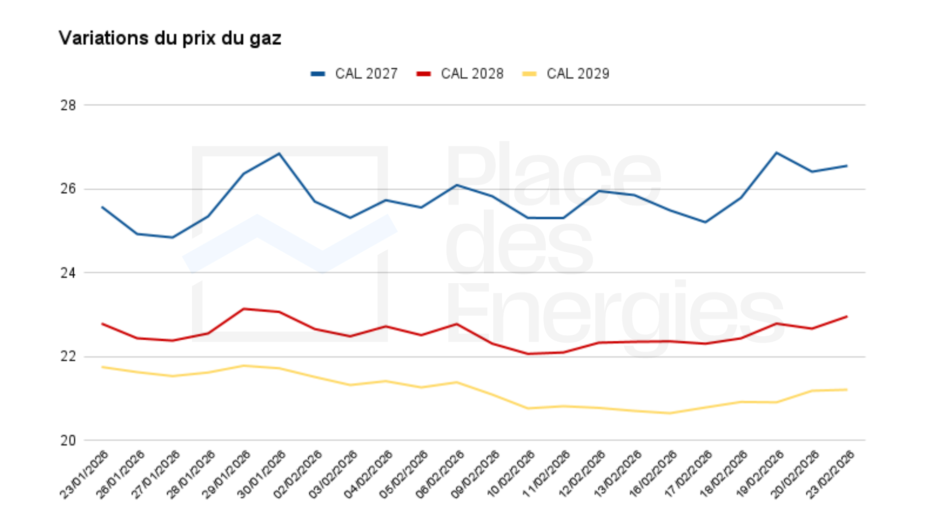 Depuis un mois, le prix PEG du gaz sur l’EEX est relativement stable. Il connaît cependant une petite hausse sur la semaine dernière. Après avoir stagné autour de 25 €/MWh entre le 9 et le 18 février 2026, il grimpe à 26,86 €/MWh le 19 février. Il redescend le lendemain à 26,41 €/MWh pour remonter ce lundi 23 février à 26,55 €/MWh.