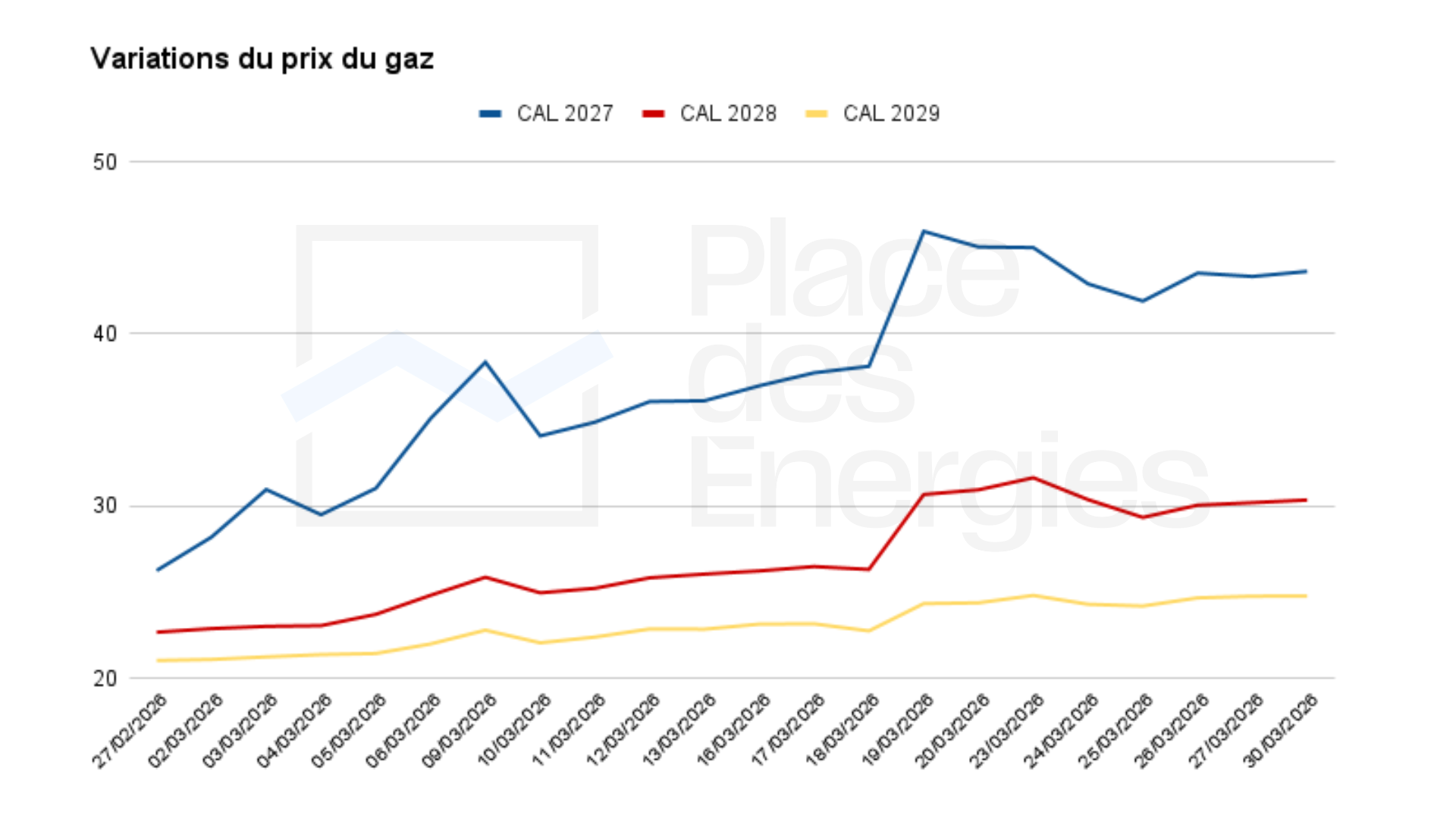 Avec des spéculations positives quant à la sécurisation et la réouverture du détroit d’Ormuz, le prix PEG du gaz sur l’EEX est en baisse la semaine dernière. Il perd 2,11 €/MWh entre le 23 (45,02 €/MWh) et le 24 mars (42,91 €/MWh). La baisse se maintient tout au long de la semaine, avec une hausse maîtrisée, à 43,34 €/MWh le 27 mars. Le prix est en légère hausse en ce début de semaine, à 43,63 €/MWh le 30 mars.