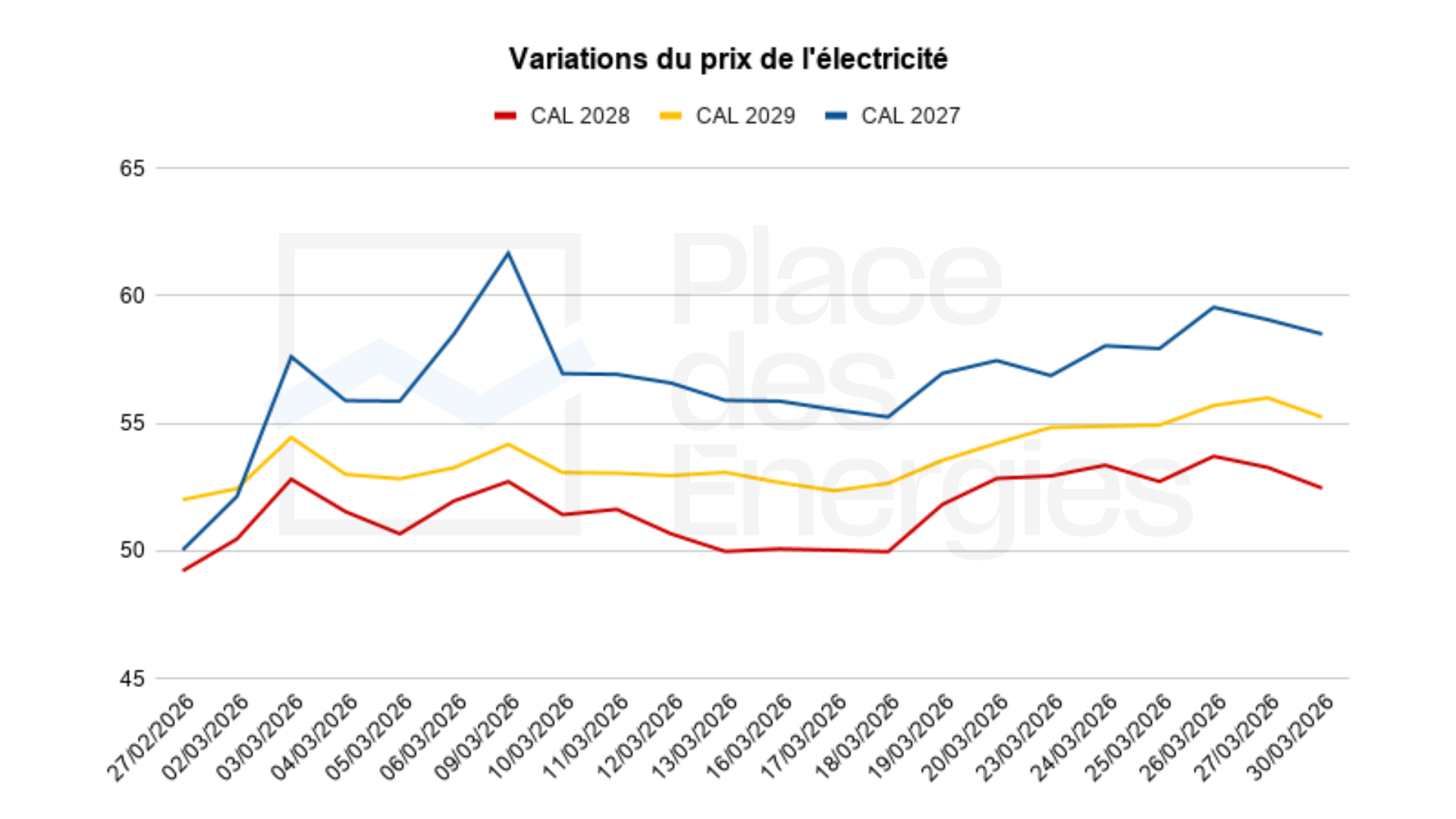 Depuis le début du conflit au Moyen-Orient, la hausse des prix de l’électricité sur l’EEX est mieux maîtrisée que pour les prix du gaz. Cette semaine, ils continuent de grimper à un rythme modéré. Le prix passe de 56,87 €/MWh le 23 mars, à 59,06 €/MWh le 27, puis il redescend doucement à 58,50 €/MWh le 30 mars pour la fin du mois.
